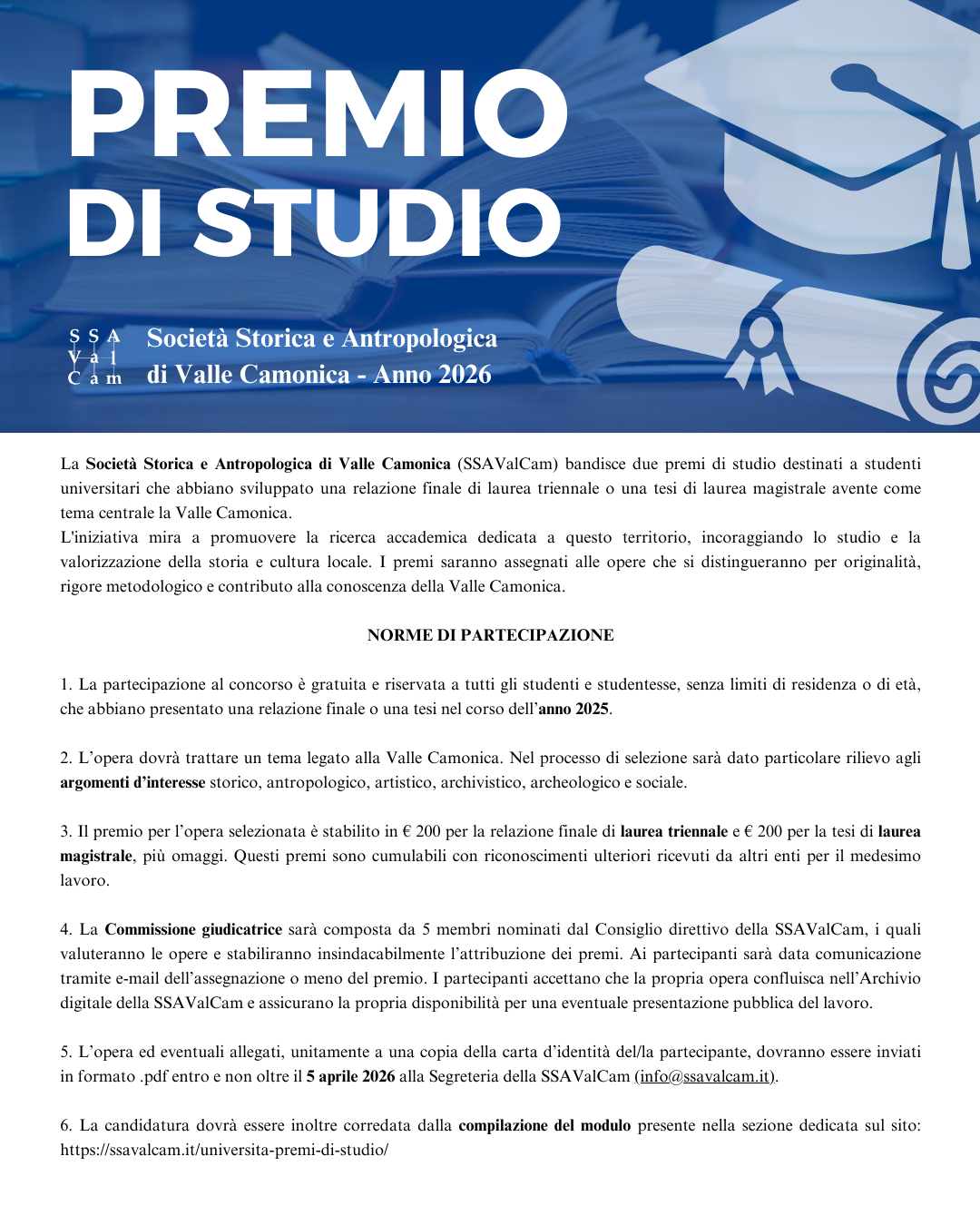La Società Storica e Antropologica di Valle Camonica (SSAValCam) bandisce due premi di studio destinati a studenti universitari che abbiano sviluppato una relazione finale di laurea triennale o una tesi di laurea magistrale avente come tema centrale la Valle Camonica.